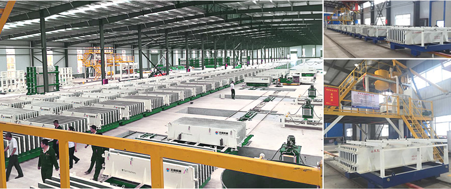 The large mixing equipment independently researched and developed by our company is equipped with precise automatic batching system which can make the feeding precise and the slurry mixing more even and mixed together well. The slurry pumping system can pump the mixed slurry into the equipment more easily and conveniently. Frequency conversion foaming technology is adopt in foaming system to improve the foaming speed and save raw materials. Wall panel molding machines work automatically with high forming speed. This production line works in a high degree of automation with simple operation and high production efficiency.