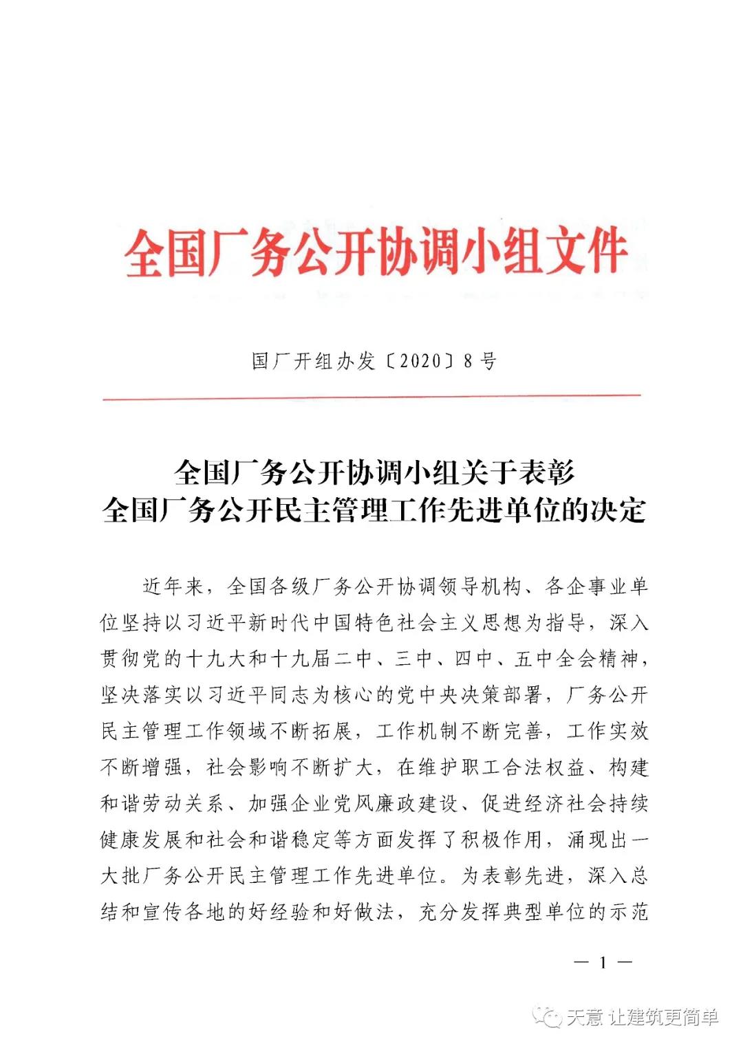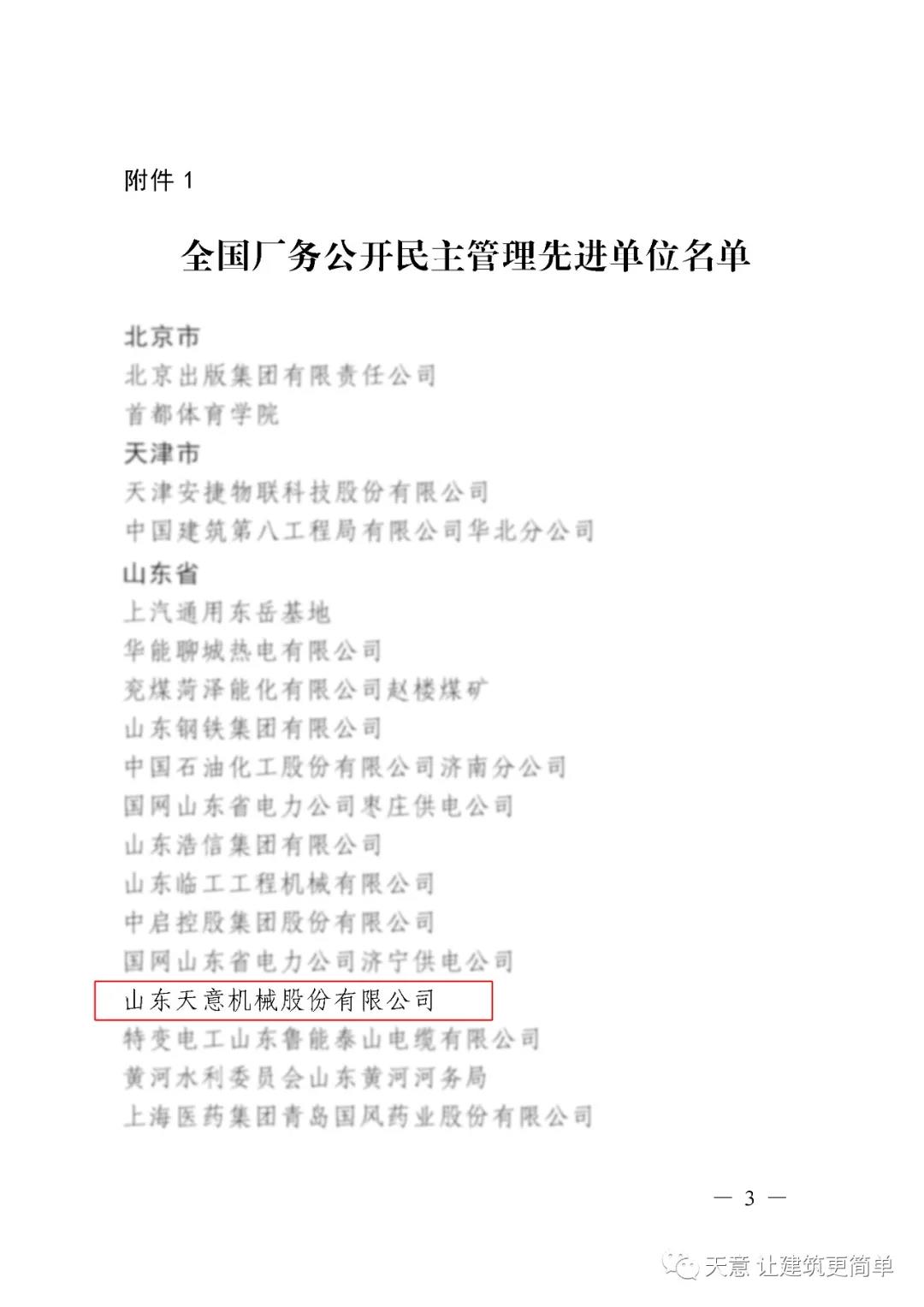 12月11日,從全國總工會(huì)傳來喜訊,山東天意機(jī)械股份有限公司被授予“全國廠務(wù)公開民主管理先進(jìn)單位”稱號(hào)。