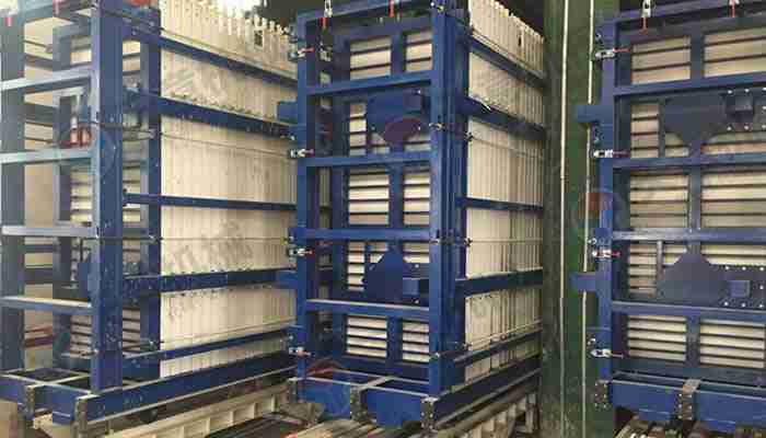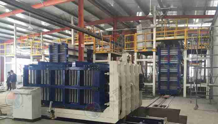 該復(fù)合墻板生產(chǎn)線立式旋轉(zhuǎn)臥式出板復(fù)合墻板成型機(jī),一次可生產(chǎn)四十塊墻板,該生產(chǎn)線主要分為:配料攪拌系統(tǒng)、墻板成型系統(tǒng)、液壓整體開模系統(tǒng)、液壓翻轉(zhuǎn)系統(tǒng)、整體出板翻轉(zhuǎn)碼垛系統(tǒng)、成型機(jī)自動循環(huán)系統(tǒng)、變頻擺渡系統(tǒng)、數(shù)控配電系統(tǒng)等部件 組成。該生產(chǎn)線自動化程度高,液壓開合模,解決了傳統(tǒng)立式復(fù)合墻板機(jī)人工開合安全隱患,提高了工作效率。設(shè)備配有整體出板碼垛系統(tǒng),解決了傳統(tǒng)人工出板方式,減少產(chǎn)品的破損率,提高了產(chǎn)能。生產(chǎn)線使用密封式泵送系統(tǒng)配備雙工位注漿槍,注漿速度快密實度高,材料粘結(jié)更緊密。